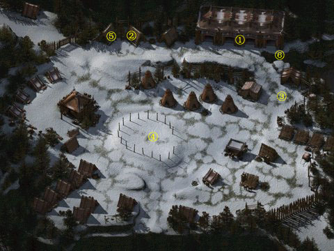 ①游戏从这里开始。一个熊族僧医在这里和我们见面,他说他名叫约勒戴尔Hjollder。并继续解释说,他的族人正准备和十镇开战,某种异象令他认为你可以防止这场冲突。他要求你赶往蛮族营地的草原大厅。