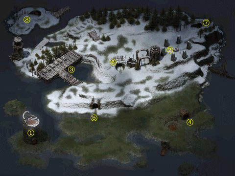约勒戴尔在⑧西北的小岛上,无法直接到达,需要进入蛮族的地下墓地。地下墓地有④、⑤、⑥、⑦四个入口,从⑦进入不会立即被大批怪物围殴。