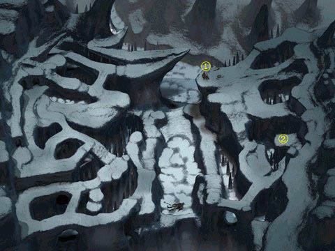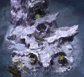 冬狼、北极熊、霜蜥蜴、霜巨人、冰河雪猿、雪巨魔,都是抗寒怕火的家伙,好对付。其中巨魔需要在其濒死倒地的时候用火或酸来彻底杀死。在①处可以捡到几瓶火油,②处可以捡到提尔农的分裂盾牌(好东西)