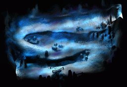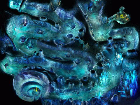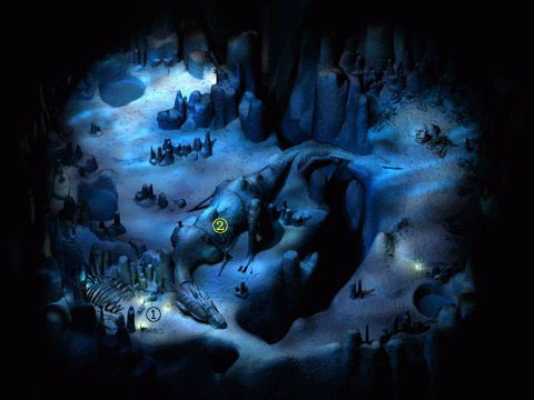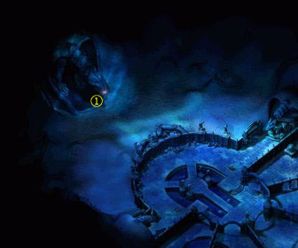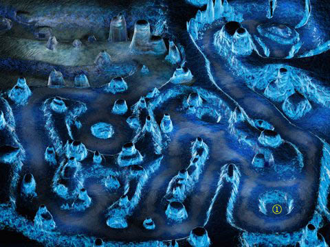 洞里只有一种怪物——雷摩海兹Remorhaz(也就是北地著名的怪物冰蠕虫,或称极地虫),攻击力很强。HP150,魔抗75%,魔火和魔寒也有75%的抗力,对其它类型的伤害倒是没有抗力。有些冰蠕虫开始时是藏在洞里看不见的,所以小心它们从队伍后面包抄过来,攻击你的远程单位。①处是冰蠕虫的窝,有不少冰蠕虫在这附近,最好从远处引它们过来打,不然被前后夹击的滋味可不好受。
