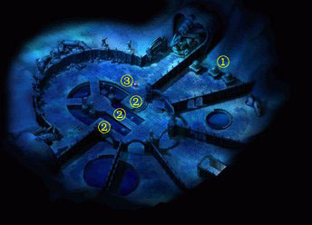 地上遍布陷阱,要格外小心!先不要去碰②处那三尊冰巨像,他们不会主动攻击你的。逐个扫清五个格子内的敌人,然后布置陷阱呀,骷髅陷阱呀,法印呀什么的,全体退在门口摆好阵势,加满祝福类法术,队伍前面招怪物(出去睡一觉再回来做这些准备更好)。最后派人用远程攻击冰巨像(回来的时候注意绕路走,别碰着自己的陷阱),鱼人王子便会带着28个部下从后面如潮水般杀出来,水池里出现近水元素(在门口布阵它们就打不到你了)。法师牧师往阵前丢面杀伤魔法,物品的特殊能力也用上,少数能冲上来的鱼人就让战士和招的怪物砍翻它,满地的战利品好壮观啊,可惜现在已经不需要钱了。最后摧毁③处的小球(小球破裂时放出雪球群),再休整一次,该见白龙王后了。