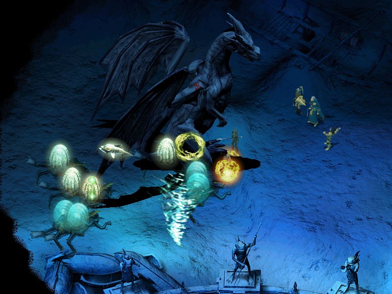 而且在龙的身后还有一群沙华鱼人:一个国王(战士,HP82),四个守卫(战士,HP71),一个高级祭司(HP53,会祝福、迷糊、定身和多种治疗神术,能给龙补血),两个次级祭司(HP42,会诅咒、定身、迷糊、封魔、纠缠,还有解除魔法)