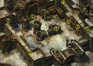 谜语的第一句提到城堡四角的塔楼,就从这开始吧。从两侧的楼梯可以爬上城墙,塔楼的门就在城墙上。③处的楼梯看上去是坏的,不过只要接近破损处,楼梯就奇迹般地自动修复了。四座塔楼都分上下两层,上下层之间的楼梯最初是隐蔽封锁的。每座塔楼的上层都有一个控制杆(按Alt键可以清楚地看见),扳下它,对面塔楼通往下层的楼梯就会出现,比如说,塔楼④中的控制杆控制塔楼⑥中的楼梯。从楼梯进入下层,接受在下层等候的勒马斯特的一个考验,就能得到一张屠龙英雄事迹卷轴。