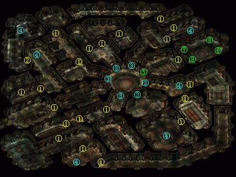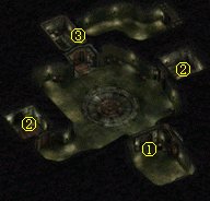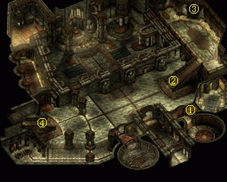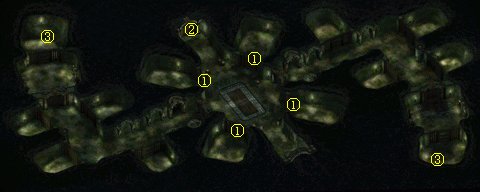 打开①处的门,队伍就会自动走到房子中间。勒马斯特出现,告诉你这里就是他当年遇难的地方,这回没有谜语,能否活着离开地牢就是考验。勒马斯特一消失,房间里便出现大量橄榄色史莱姆Olive Slime,它们的攻击带毒,免疫物理攻击和电,但用其它种类的元素魔法攻击还是非常有效的。房间中间还有定身魔法的陷阱。两边的房间②里是史莱姆殭尸,魔抗100%但怕物理攻击,同样有毒。出口的门是锁住的,先要解锁或破门。打开③处的暗门,就可以离开这里了。