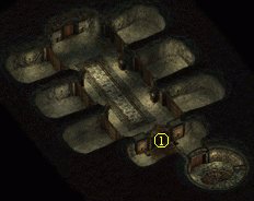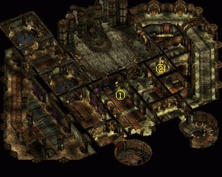 楼上同样有许多难缠的幽灵守卫。需要注意的是,这里有魔眼!因为IWD没有防死结界,所以魔眼的死光相当可怕,为保队员不出意外,需要招怪物(比如操纵死尸),顶在前面。善良牧师的7级神术“高级洛山达神盾”似乎可以防御死光,不过我没有试验。在①处你会遇上这座城堡的主人玛路拉德领主Lord Maluradek。从前面的剧情中可以知道他可不是什么好东西,除掉他。胜利之后进入右边的小房间,有一扇暗门通往暗格②,暗格的地板上有一把钥匙,它打开楼下的木门。